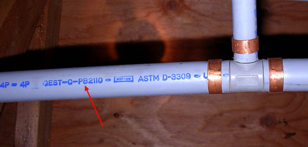 The best way to identify polybutylene is by the lettering on the pipes. The piping will often have lettering along its length, identifying the manufacturer, as well as the pipe type and size. There were three major manufacturers: Shell Chemical Company, Quest, and Vanguard. Quest piping, for instance, was often stamped “Quest” and “PB2110.”